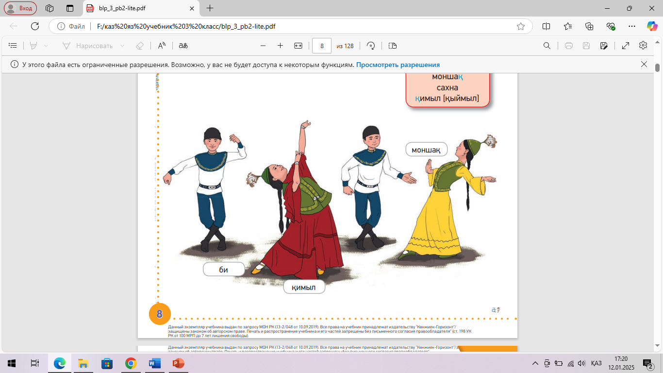 Қызығушылықты ояту. «Қадамдар» ойыны. Оқушылар сөйлемдер айтып, қадамдар жасайды. Бір сөйлем – бір қадам. Оқушыларға сөйлемнің басы ұсынылады. Денім сау болу үшін мен ..................................... Аспаптық құлақ күйін келтіру. Топқа бөлу. Жұптық жұмыс жасауға тапсырма әзірлеу. Кілт сөздерді тақтаға жазу. Жұптаса отырып сұраққа-жауап беру, кілттік сөздерді пайдалана әңгіме құру. Оқу мақсатымен, тілдік мақсатпен танысады; Жетістік критерийлерін болжайды; Жаңа сөздер: Би – танец Моншақ – бусы Сахна – сцена Қимыл – движение