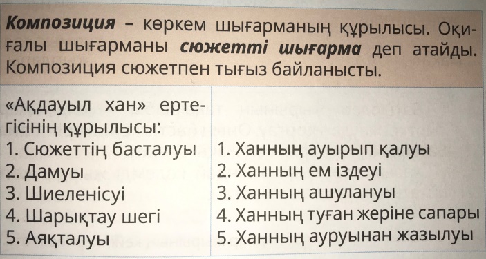 4.1.1.1. шығарманың мазмұнын толық түсірну кейбір тұстарын талқылау,оқиғаның себеп-салдарын анықтау үшін сұрақтар қою және жауап беру |