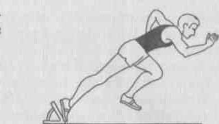 Бұл жағдайда аяқ тізесінің дұрыс бүгілуі маңызды болып табылады. Бел мен тіреуіш тізе арасындағы бұрыш 92-105° болуы қажет. Дене мен алдыңғы тұрған аяқ арасындағы бұрыш 19-23° құрайды. Бұл бұрыштардың мағынасын төменгі сөрені меңгерген кезде, соның ішінде бастапқы қалыпын транспортир арқылы өлшеуге болады (3 сурет. б). Жүгірер алдында спортшы сабырлы және жинақы болуы керек. Яғни, жинаулы серпімді қалыпында болуы керек, аз уақыт аралығында жүгірісті бастауға дайын болуы керек, өйіткені «Назар аудар!» мен «Алға!» командаларының арасындағы уақыт ережеде жоқ, ол уақыт тікелей төрешіге байланысты. Жалпы жағдайда қолдар еркін қимылдайды, бірақ кейбір жаттықтырушылар қолдарды сермеуді бірқалыпты және аяқтың көтерілу деңгейінен биік көтергенді қалайды. Бұл спортшының жүгіретін арақашықтықтың басын үдемелі түрде бастау үшін істеледі. Жоғарғы деңгейдегі спортшылардың тіреуіштен итерілу кезіндегі жасайтын бұрыш 42-50° құрайды. Сөре дыбысын естіген бойда (пистолеттен ату, дауыстай бұйрық) спортшы алға қарай қимылын бастайды, ол үшін бір уақытта қол және аяғымен бірдей итеріледі. Аяқпен итерілу үшін тіреуіштерді пайдаланады. Ары қарай қол-аяқтарын сермеу арқылы қозғалысын жалғастырады (4 сурет).