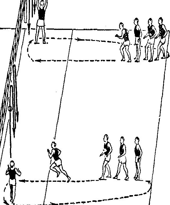Оқушыларға ҚЕ туралы естеріне салу. «Орын ауыстыру арқылы допты қуу». Сынып екі топқа бөлініп 10 м. арақашықтықта қарама-қарсы бір қатарға сап түзеп тұрады. Қатардағы оқушылардың ара қашықтығы 3-4 м. болу қажет және 1-ші 2-шіге саналады, бірдей сандағы оқушылардың арасында бөлек сандағы оқушылар тұруы керек. Екі топтағы 1 нөірлер бір команда құраса 2 нөмірлер екінші команданы құрайды. Екі қатардың да шеткі ойыншыларында доп олады және оларды шеңбермен белгілеп қоямыз. Мұғалімнің белгісі бойынша диагоналмен допты қарсы тұрған ойыншыға жалғау керек және соның орнына тұру үшін жүгіреді, ал, допты қағып алған ойыншы диагоналмен келесіге жалғайды ойын солай жалғасады. Доп ең шеттегі тұрған ойыншыға жеткен кезде ол допты алып жүру арқылы қарсы сапты айнала жүгіріп белгіленген орынға бірінші болып жету керек. Ойын аяғында ойыншылар өздерінің бастапқы орындарынан табылу керек. Бастапқы сапты қай топ бірінші жабдықтайды сол топ жеңіске жетеді.