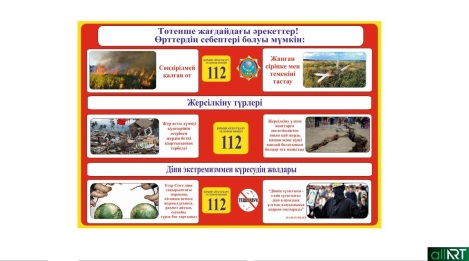 Өрт – бұл бақылауға алынбайтын жану үрдісі, адам өмірі мен денсаулығына, материалдық құндылықтарды жоюға қарай сүйемелдейтін тілсіз жау. Өрттің негізгі әсер етуші факторлары: ✓ қоршаған ортаның жоғары температурасы; ✓ түтін құрамында улы заттар бар; ✓ түтін салдарынан көрінудің жоғалуы. Өрт кезінде не істеу керек: ✓ Өрт кезінде 101 нөміріне қоңырау шалу керек. ✓ Өрт сөндіру: эвакуация, өрт шығу жолдарын пайдалану. ✓ Су тасқыны: биік жерлерді іздеу, жертөлелерден аулақ болу. ✓ Жер сілкінісі: күшті заттардың астында баспана, ашық кеңістікті пайдалану. Топтық жұмыс: нақты сценарий үшін төтенше жағдай жоспарын құру. «Сөйлемді аяқта» ойыны «Сөйлемді аяқта» ойыны бізге осы ережелерді есте сақтауға көмектеседі.