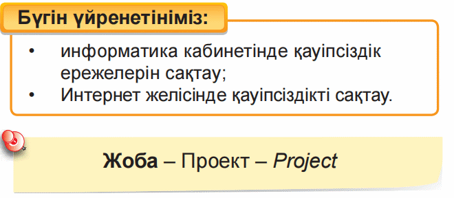 Дескриптор: - Анар мен Самат компьютер алдында қандай ережені бұзғаны туралы айтады -Суретке қарап әңгімелейді Сергіту сәті «Балық, құс, аң» Мақсаты: Жүргізуші ойыншылардың жанына барып жаймен ғана «балық, құс, аң» - деп айтып-айтып келеді де, бір ойыншының жанына барған кезде дауысын қаттырақ шығарып: - Балық!(немесе аң, құс) –деп айтып қалады. Сол мезетте ол ойыншы бірден өзі білетін кез-келген балықтың атын айтып үлгеруі керек. Айта алмай қалса, ол ойыннан шығады. Ойын ең соңғы ойыншы қалғанша жалғаса береді EБҚЕ бар балалар үшін тапсырма Интернет желісіндегі қауіпсіздікті қалай сақтауға болады Дискриптор Сұраққа жауап береді Сабақты қорытындылау. 4-тапсырма «wordwall» платформасы бойынша сұрақтарға жауап береді Дескриптор: -жаңа тақырып бойынша сұрақтарға жауап береді |
