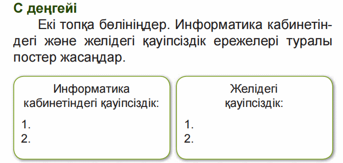 Дескриптор -Информатика кабинетіндегі желідегі қауіпсіздік ережелері туралы постер жасайды Жұптық жұмыс 2 -тапсырма «Көршіңізге айтыңыз» «Көршіме айтамын» әдістемесі арқылы жұптарынмен анықтайды