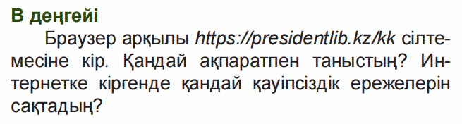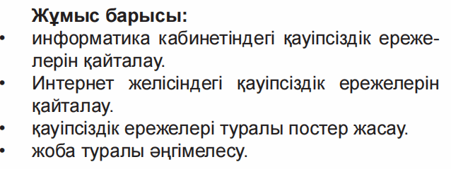 Дескриптор: -Браузер арқылы көрсетілген сілтемеге кіреді -Интернетке кіргенде қандай қауіпсіздік ережелерін сқтағанын айтады Жеке жұмыс. Компьютермен жұмыс 3-тапсырма «Ой қозғау» әдісі арқылы тапсырманы орындау