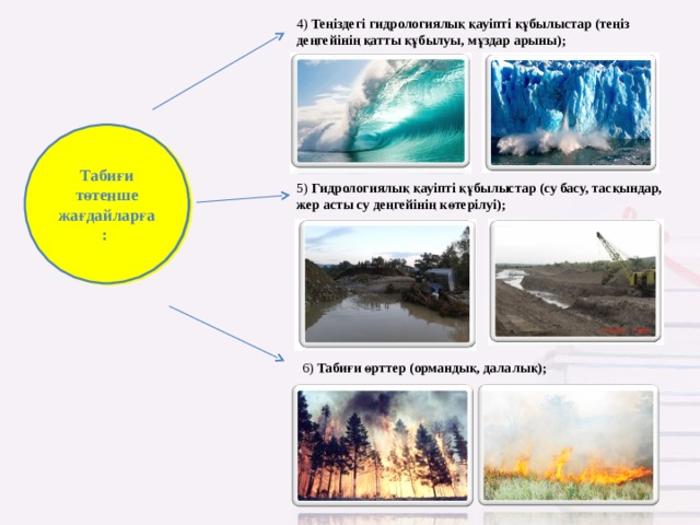 ЕБҚ 2-тапсырма Табиғатта қандай қауіпті жағдайлардың болатынын еске түсір. Үлкендерден қандай қауіпті табиғат жағдайларын естідіңдер? Табиғи сипаттағы төтенше жағдайлар –дүлей зілзала (жер сілкінісі, сел, көшкін,су тасқыны, және басқалар),табиғи өрт, індеттер мен малдың жұқпалы аурулары жатады. |