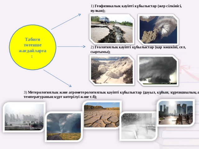 Жаңа сабақ ФС тапсырма 1-тапсырма Табиғат құбылыстары деген не екенін есіңе түсір. Сен қандай табиғат құбылыстарын білесің? Шаңды дауыл,жер сілкінісі,құрғақшылық, температураның күрт көтерілуі. |