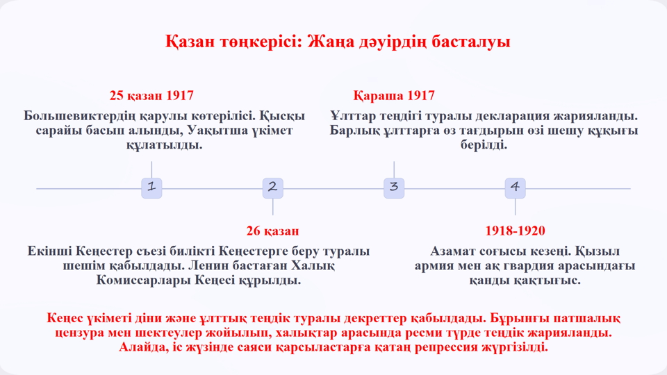 8.1.1.1 тарихи оқиғаның нәтижелерін талдау арқылы әлеуметтік құрылымның өзгеруіне Қазан төңкерісінің әсерін сипаттау; 8.2.1.1 тарихи кезеңдердің ерекшеліктерін салыстыру арқылы мемлекет пен діннің өзара қатынасын сипаттау. |