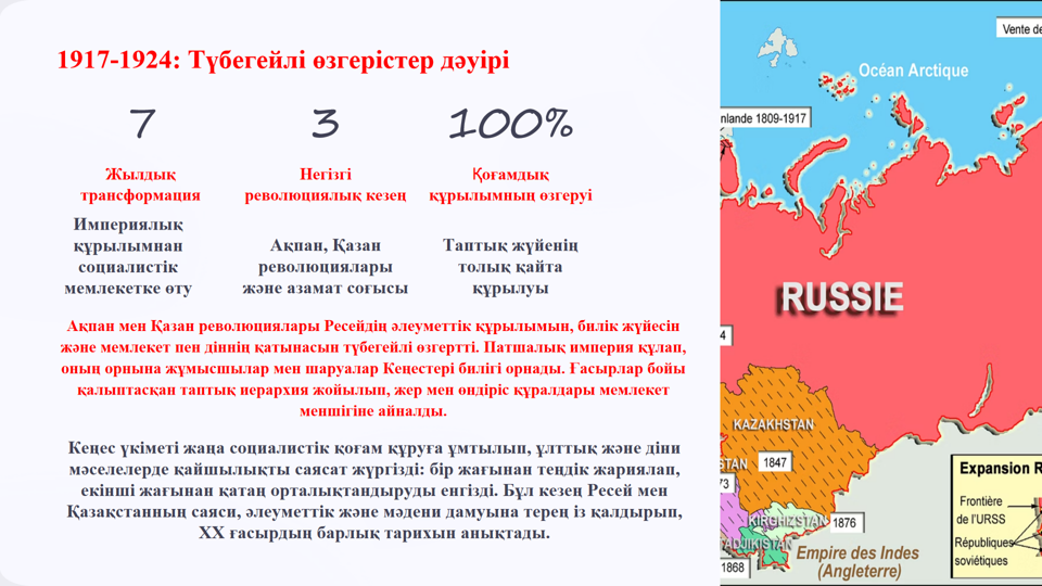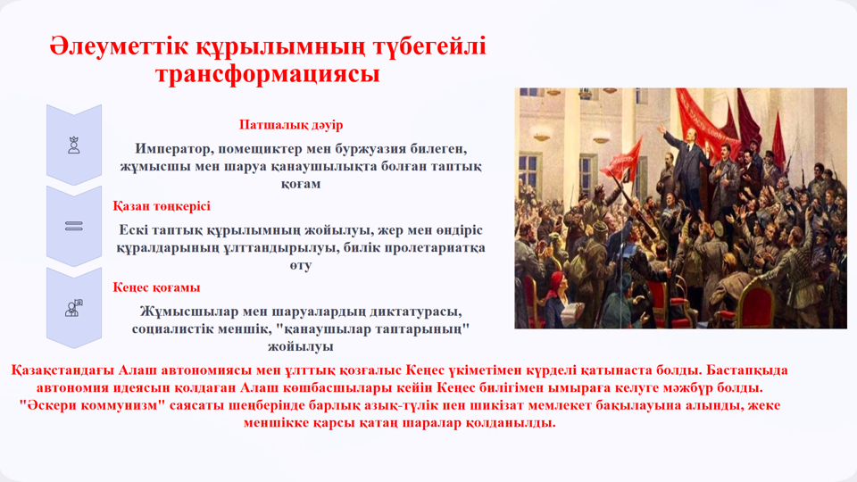 Қазан төңкерісінің әлеуметтік құрылымға әсерін талдау, мемлекеттің тарихи кезеңдердегі жүйесін сипаттау. |