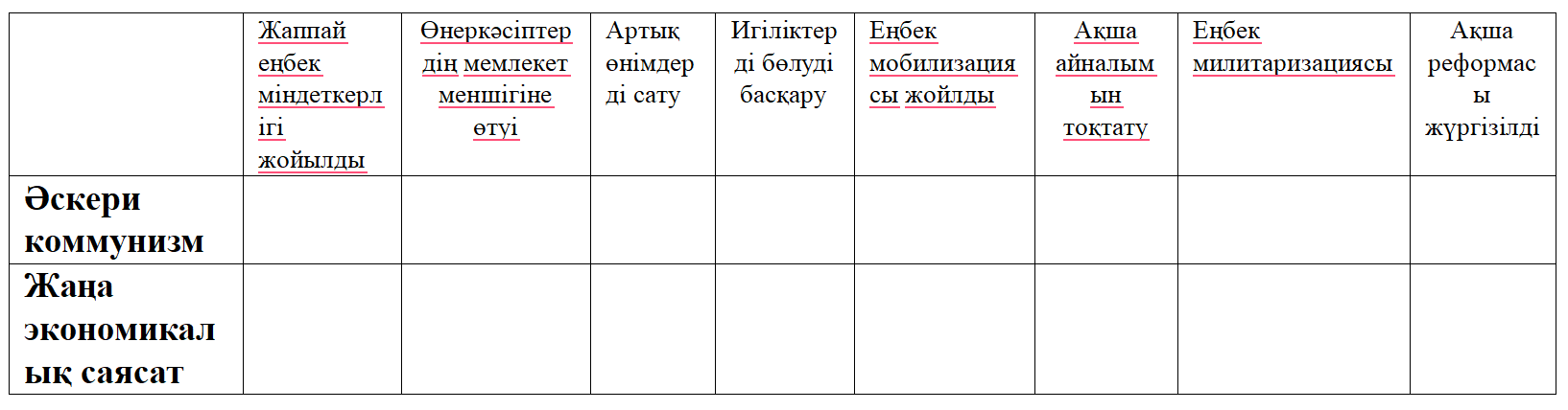 Дескриптор: Әскери коммунизм, жаға экон. Саясат туралы біледі-4 балл |