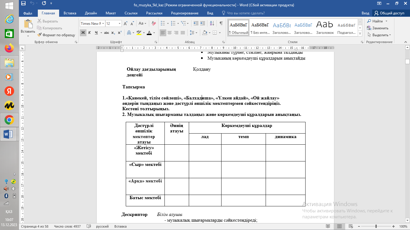 №1 Тапсырма. Жұптық тапсырма. Дәстүрлі әншілік мектептерді және халық әнінің орындаушыларын анықтаңыз, кестені толтырыңыз.