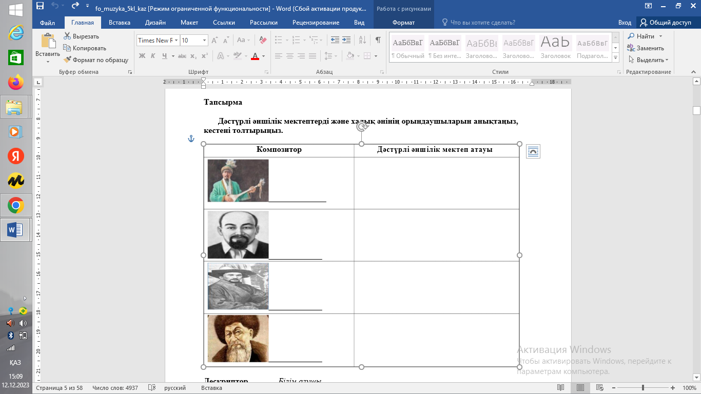 №3 тапсырма. Кестені толтырыңыз. Суреттерге қарап, салт-дәстүрді анықтаңыз, оны 2-3 сөйлеммен түсіндіріңіз. Ұқсастығы мен айырмашылығын ажыратып, музыканың мінезін анықтаңыз. Тапсырма №4 .«Бесік жыры», «Тұсау кесер», «Жар-Жар», «(Жарапазан,» әндерін тыңдаңыз және дәстүрлі әншілік мектептермен сәйкестендіріңіз. Кестені толтырыңыз.