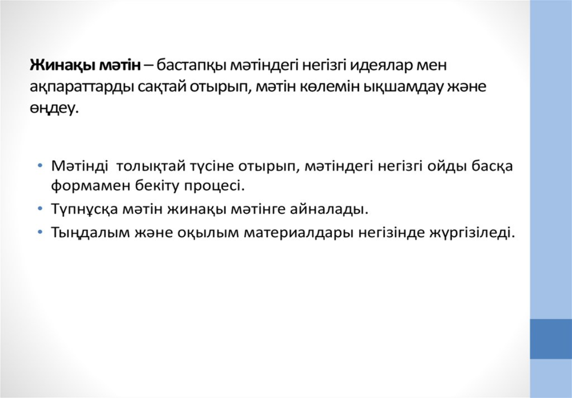 3. Жазылым. жеке жұмыс 4-тапсырма . оқылым және тыңдалым материалдары бойынша мәтіннің баяндау желісін сақтап, әр бөлігінен алынған ақпараттардан жинақы мәтін(аннотация) жазады. |