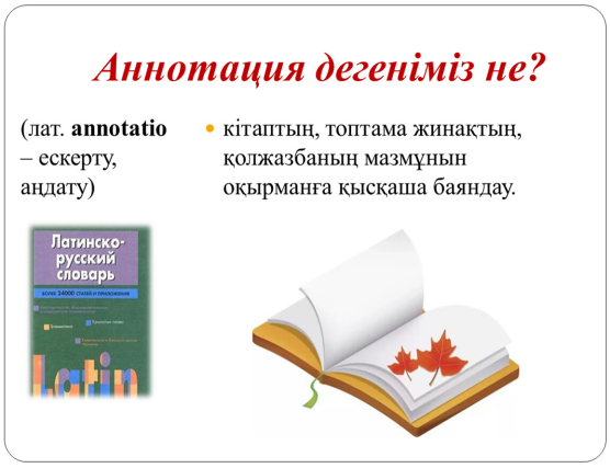8.2.2.1 публицистикалық және ғылыми стиль ерекшеліктерін қолданылған тілдік құралдар арқылы тану; 8.3.5.1 оқылым және тыңдалым материалдары бойынша мәтіннің баяндау желісін сақтап, әр бөлігінен алынған ақпараттардан жинақы мәтін(аннотация) жазу; |