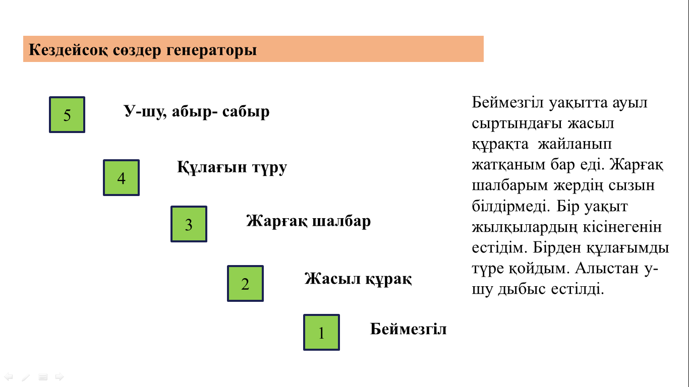 ТЖ. Тапсырма: Топтарға өзге топтар үшін тапсырма құрастыру ұсынылады. Шығарма үзіндісін оқи отырып, кез келген 5 сөзді таңдап, кездейсоқ сөздер генераторы кестесін құрады. Дескриптор: Әңгіме үзіндісін оқи отырып, 5 сөзді таңдайды; кездейсоқ сөздер генераторы кестесін құрады. ЖЖ. Топтар дайын кестені өзара алмастыра отырып, шағын әңгіме бөлігін жазып шығады. Дескриптор: кездейсоқ сөздер генераторы кестесін қолданады; әңгіме сюжетіне өзгеріс енгізеді; оқиғаны дамытады; шағын әңгіме жазады. Жазылымнан кейінгі тапсырма Өзара бағалау тақырып таңдауы; құрылым (басы, ортасы, аяғы); кім? (не?), қайда? қашан? не болды? деген сұрақтарға жауап береді; оқиға, орын, уақыттың көрініс табуы; оқиғаға қатысты кейіпкерлердің қамтылуы; тақырыптың ашылуы. |