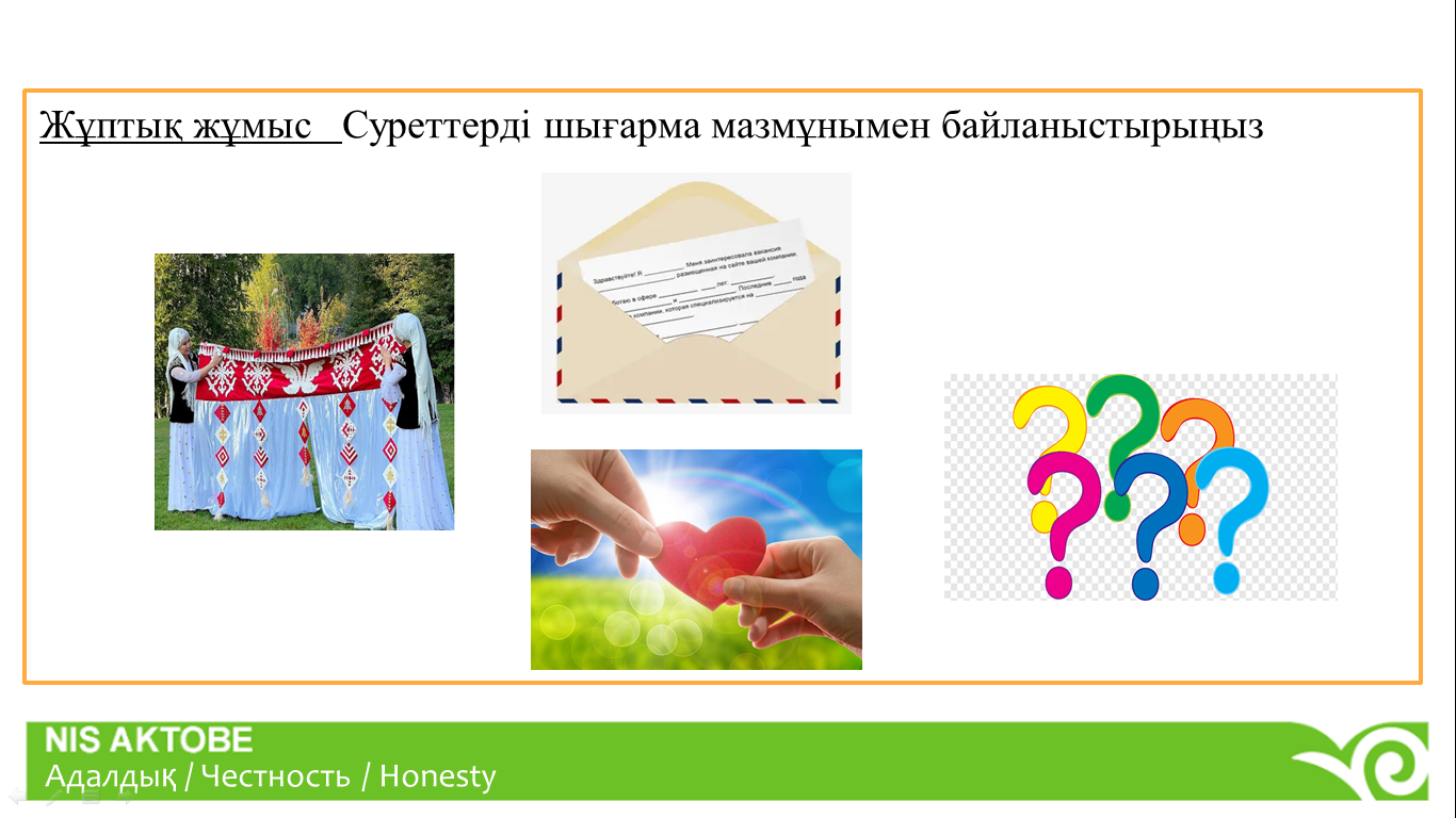 1-сабақ https://www.flippity.net/RandomNamePicker.htm Сынып оқушыларын 4 топқа бөлу. Қызығушылықты ояту. Суреттер бойынша қысқаша ой толғау Жұптық жұмыс Суреттерді шығарма мазмұнымен байланыстырыңыз