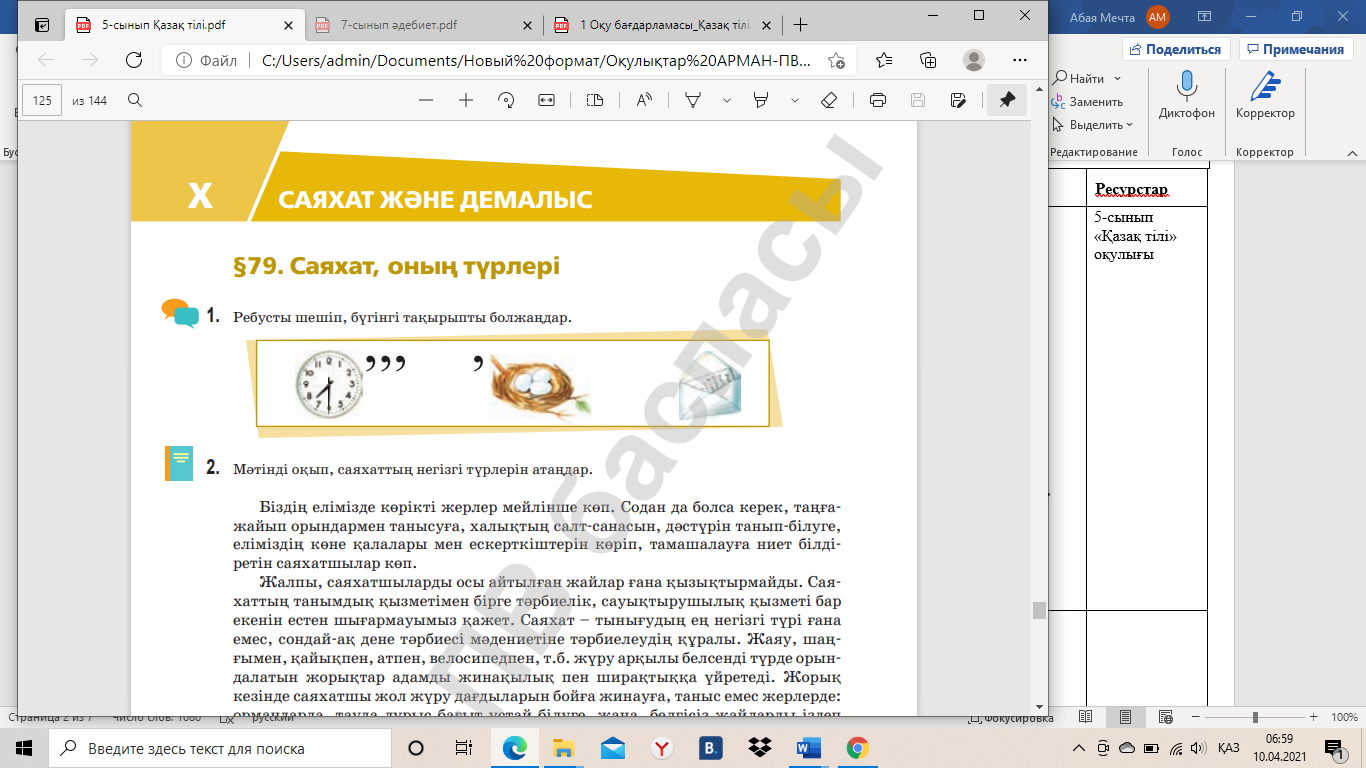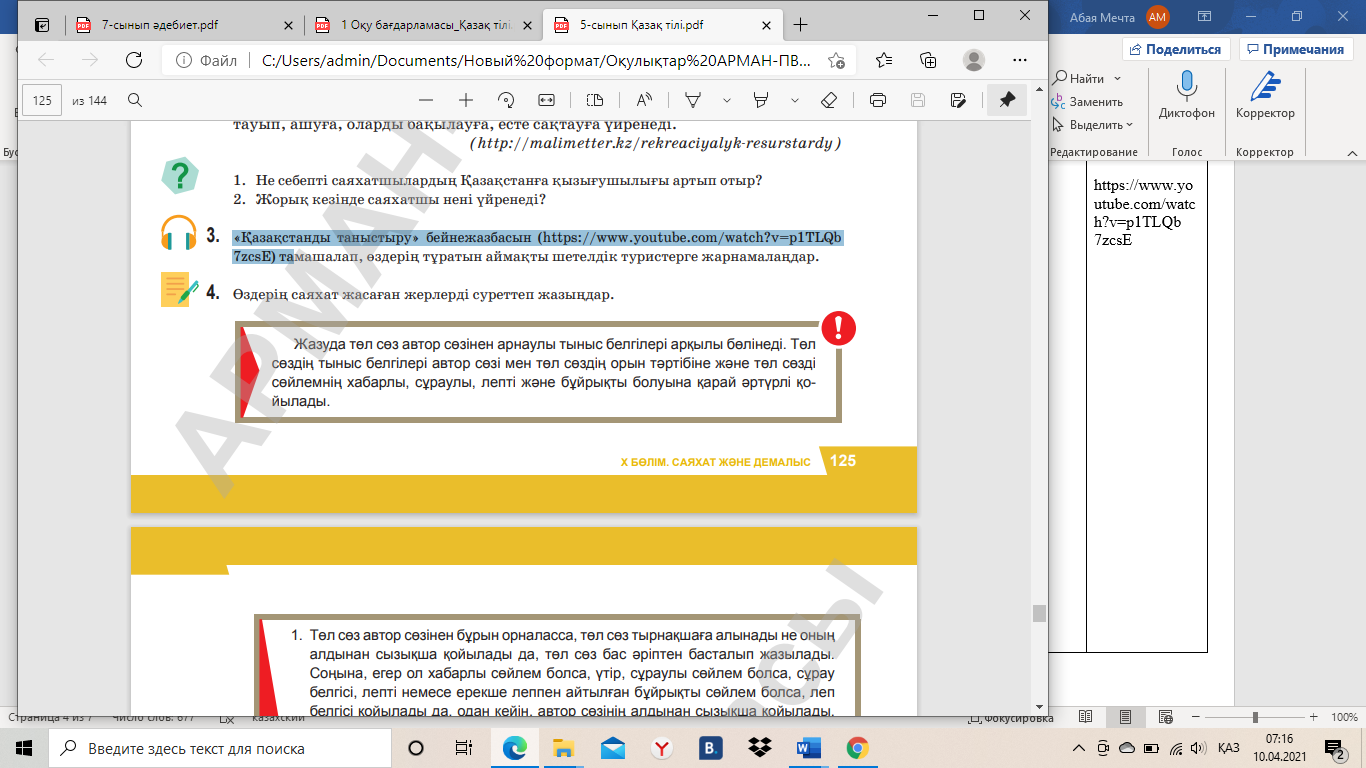 Оқушылар оқылым мәтінімен танысады. Мәтінде айтылған мәліметтің дұрыс немесе бұрыс екенін анықтайды. Дұрыс болса оң қолын көтереді, бұрыс болса сол қолын көтереді. «Қазақстанды таныстыру» бейнежазбасын тамашалап, (https://www.youtube.com/watch?v=p1TLQb7zcsE) «РАФТ» тәсілін орындау. Оқушылар топпен орындап, бір бала қорғайды. Грамматикалық тақырыпты меңгереді. Төл сөздің тыныс белгісін дұрыс қойып, суреттердегі саяхатқа шыққан балалардың іс-әрекеті туралы пікір