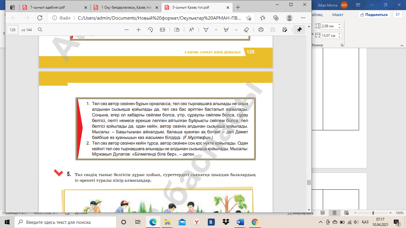 5.1.5.1. Тыңдалған мәтін мазмұны негізінде сұрақтарға жауап беру, көтерілген мәселе бойынша өз ойын білдіру. 5.3.2.1. Жанрлық ерекшеліктеріне сай ресімделуі мен құрылымын сақтап, хат, жарнама, хабарландыру құрастырып жазу 5.4.5.5. Төл сөз, төлеу сөз, автор сөзінің тыныс белгілерін дұрыс қолдану |