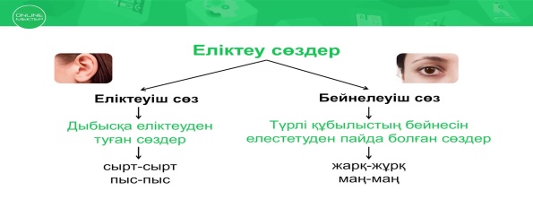 Еліктеуіш және бейнелеуіш сөздерді ажыратады, сөздердің мағынасын мәтін бойынша анықтайды |