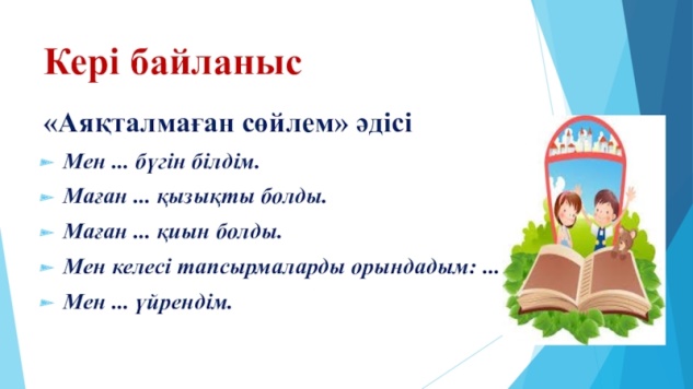 Дескриптор: Артық сөздерді табады-1Б Тапқан сөздермен сөйлем құрайды-1Б Дескриптор: Сызбаға еліктеу сөздерді бөліп толтырады-1Б Көру арқылы және есту арқылы жасалатын еліктеу сөздерді ажырата алады-1Б Дескриптор: Жаңылтпашты жаттап, жатқа жазады-1Б Еліктеу сөзді тауып, түрін ажыратады Дескриптор: Мәтінді оқып, сөздердің мағынасын ажыратады-1Б Қарамен жазылған сөйлемді еліктеуі бар сөйлемге айналдырады-1Б «Аяқталмаған сөйлем» әдісі |