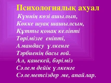 Өлең жолдарын хормен оқиды Өткенді пысықтайды Мәтін бойынша диалог құру: әртүрлі деңгейдегі оқушылар жұптасып, өз деңгейіне сай жауап дайындайды Тапсырманы орындайды Сұрақтарға жауап береді Жеке жұмыс жасайды Мақалды оқиды Үй тапсырмасын алады Тапсырма бірдей болғанмен нәтиже әртүрлі болады Тапсырманы орындайды Кері байланыс жасайды |