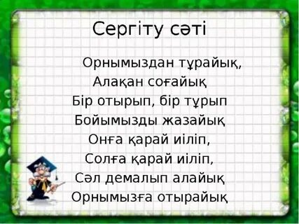 3.1.2.1 түрлі жағдаяттағы қатысымдық әрекеттерде өз сөзін жүйелі түрде жоспарлап, сөйлеу мәдениетін сақтап, диалогке қатысу 3.2.3.1 мəтін мазмұны бойынша пікір білдіруге бағытталған сұрақтар құрастыру жəне жауап беру; |