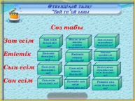 Зат есім Етістік Сын есім Сан есім Сөзжұмбақ шешу Қалған бесеуін мына сөзжұмбақты шешу арқылы табайық. ЕСІМДІК ҮСТЕУ ШЫЛАУ ОДАҒАЙ · ЕЛІКТЕУ Саралау әдісі: дереккөздер 2-жаттығу Кестемен жұмыс. Әр қатардағы артық сөздерді табу Артық сөздер: Зат есім емес-суық(сын есім) Етістік емес-боран(зат есім) Сын есім емес –шөл(зат есім) Сан есім емес-қос(етістік) ЕБҚ Мақсаты: көркем жазуға баулу Сөздікпен жұмыс. Дұрыс жазу емлесі. Қауырсын, кемпірқосақ, үшкір. Ереже: Зат есім-заттардың атын білдіреді Етістік-қимыл-қозғалысты білдіреді Сын есім-заттың сынын білдіреді Сан есім-заттың санын білдіреді ЕҚБ Мақсаты: ережелерді түсіндіруді үйрету Ережені өз сөзіңмен түсіндіріп көр. Саралау әдісі: жеке жұмыс 3 жаттығу «Микрофон» әдісі Оқылым Сұрақтарға жауап беру. 1-жауап: Сөз таптары зат есім,етістік,сын есім,сан есім,есімдік, үстеу, шылау, одағай, еліктеу сөз. 2-жауап: Бір сөз табы екіншісінен өзіндік белгілері арқылы аажыратылады 3-жауап: Морфологиялық талдау сұрақтар қою арқылы жасалады ФС тапсырмасы 4-жаттығу Өлеңді көшіріп жазып, морфологиялық талдау жасау. Үлгі: Қандай? Не? Қандай? Не? Қандай? Не? Барқыт тау,жасыл дала, зеңгір аспан Барқыт,жасыл, зеңгір-сын есімдер Тау, дала,аспан-зат есімдер Үйге тапсырма 5-жаттығу Тігінен: 1.Ауаның біркелкі қозғалмауынан пайда болатын құбылыс. 2.Ағашқа қар секілді қонған аппақ зат Көлденеңінен 1.Ыстық және суық ауаның соқтығысуынан пайда болатын күшті жарқыл. 2.Көктем мен күзде шөп асына тұратын дымқыл су.