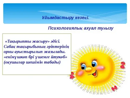 Сабаққа дайындық жасап, жақсы тілектер тілейді. Үй тапсырмасын пысықтайды Тапсырманы орындайды Мәтінмен жұмыс жасайды Тапсырманы орындайды Ребусты шешеді Тапсырманы орындайды Тапсырманы орындайды Үй тапсырмасын алады Кері байланыс жасайды |
