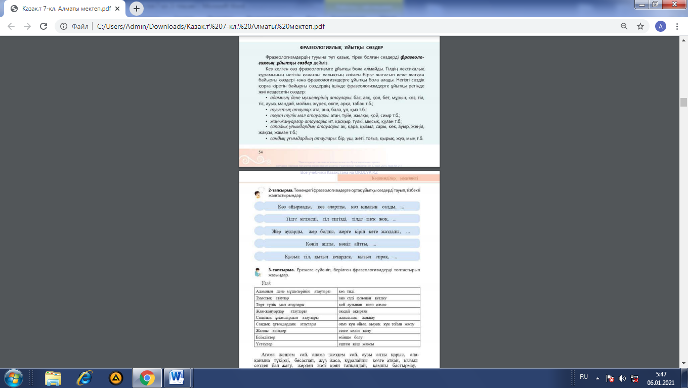 7.1.6.1 коммуникативтік жағдаятқа сай көркем бейнелеуіш, эмоционалды-экспрессивті сөздерді және мақал-мәтелдер мен тұрақты тіркестерді еркін қолданып, диалогке қатысу, пікірталаста тез және дұрыс шешім қабылдай білу; 7.4.3.1 фразеологизм, мақал-мәтелдердің эмоционалды мәнін, көркемдік ерекшеліктерін түсініп қолдану. |