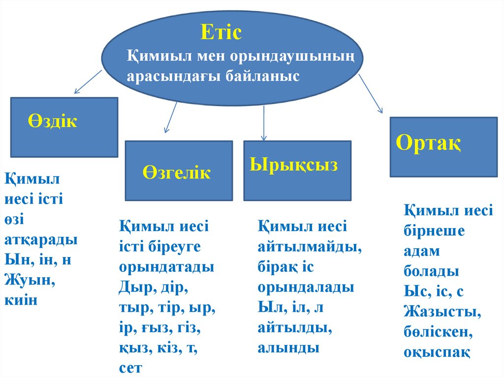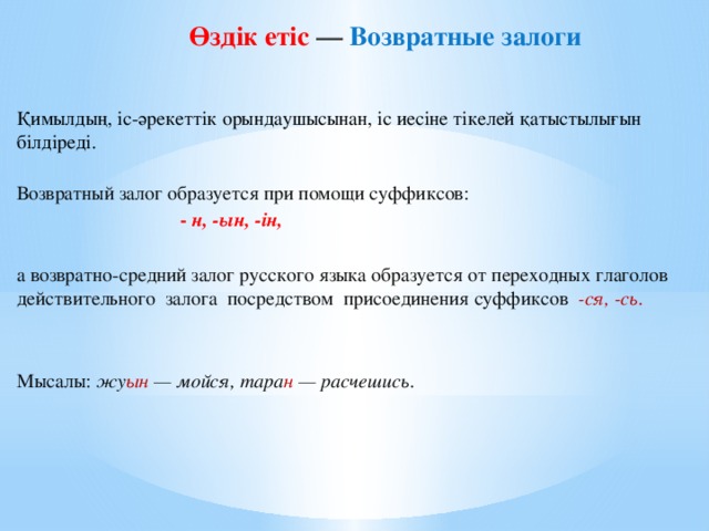 Барлық оқушылар: өздік етістің қызметін біледі, ауызша және жазба жұмыстарда орынды қолдана алады; берілген тақырыпқа сай сөздерді орынды қолдана отырып, мақсатты аудиторияға арналған ауызша мәтіндер құрай алады. |