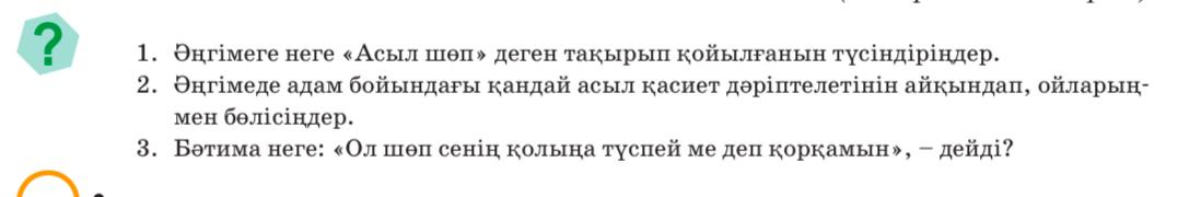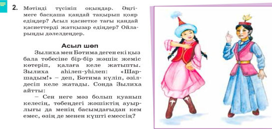 Мәтінді оқиды, тақырып қояды, асыл қасиеттерді атайды.