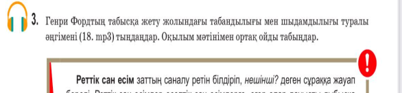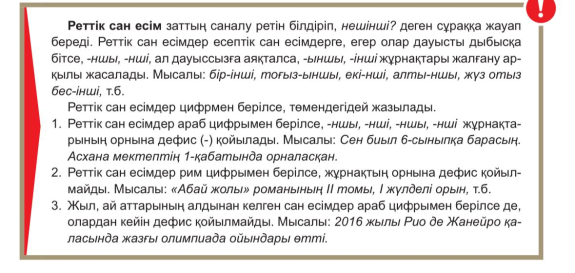 5-тапсырма. Абайдың 19-қарасөзін түсініп оқып, ондағы негізгі ойды реттік сан есімдерді пайдалана отырып жазыңдар. Үлгі: ......: біріншіден, естіп, көріп, ұстап, татып ескерсе, дүниедегі жақсы, жаманды таниды дағы , сондайдан білгені, көргені көп болған адам білімді болады. Екіншіден, естілердің айтқан сөздерін ескеріп жүрген кісі өзі де есті болады.