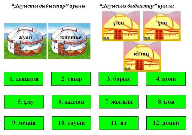 Мақсаты: жаттығуларды орындау барысында сөздердегі дауысты у және дауыссыз болып келетін жағдайларды ажыратуға, сөздерге дыбыстық талдау жасай білуге үйрету; сөздік қорын, қисынды ойлауын, байланыстырып сөйлеу тілін дамыту; еңбек, адамгершілік тәрбиесіне баулу. Сабақтың түрі: қалыпты сабақ Сабақтың әдіс-тәсілдері: сұрақ-жауап, жинақтау, көрнекілік. Сабақтың көрнекіліктері: мазмұнды суреттер |