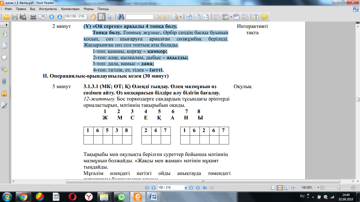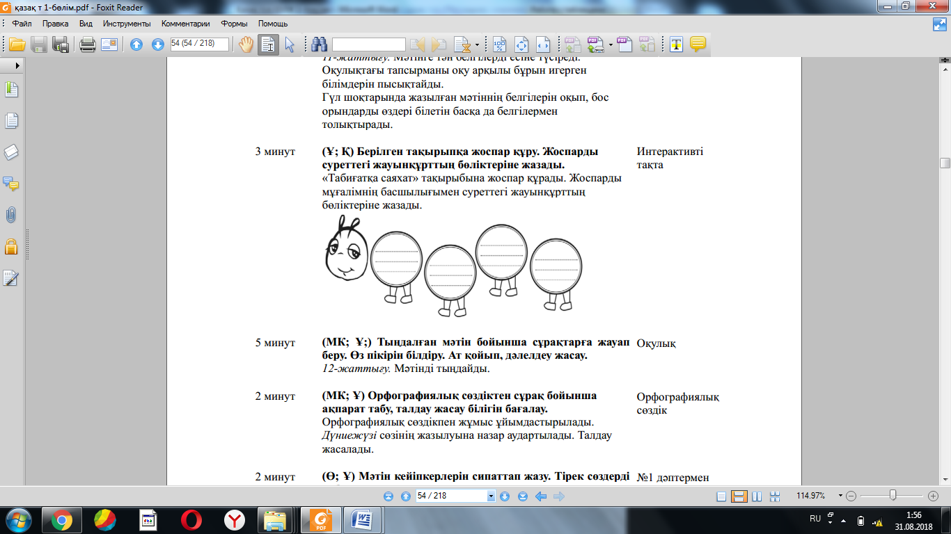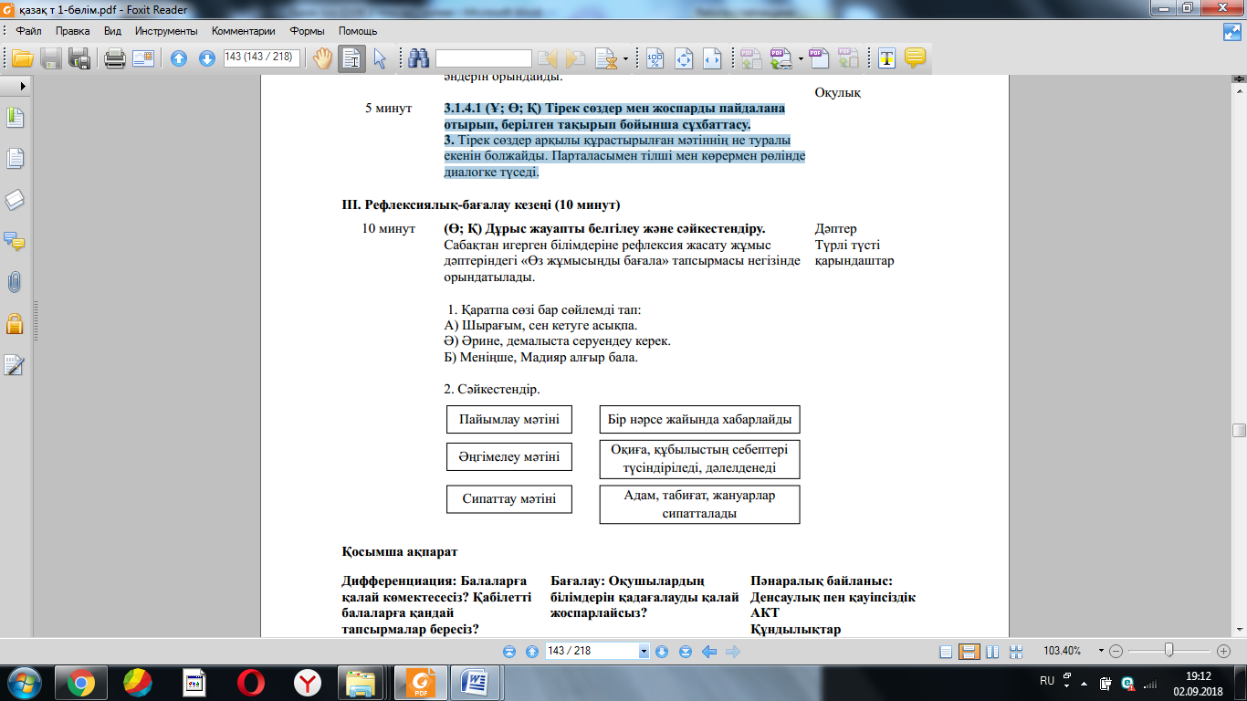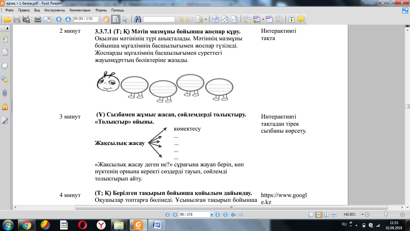 3.2.4.1 өз бетінше мəтіннің тақырыбын жəне мұғалімнің көмегімен негізгі ойды анықтау; 3.3.3.1 оқыған, тыңдаған жəне аудиовизуалды материалдар бойынша мұғалімнің көмегімен жоспар құрып, мазмұндама жазу; 3.2.3.1 мəтін мазмұны бойынша пікір білдіруге бағытталған сұрақтар құрастыру жəне жауап беру |