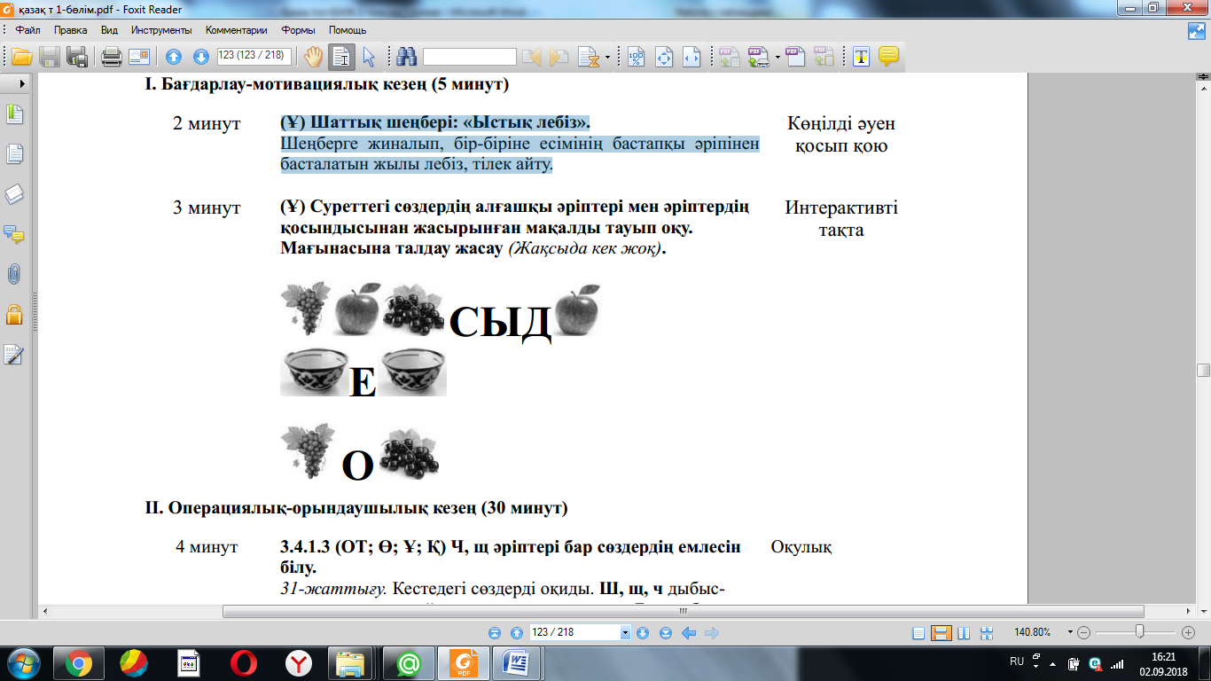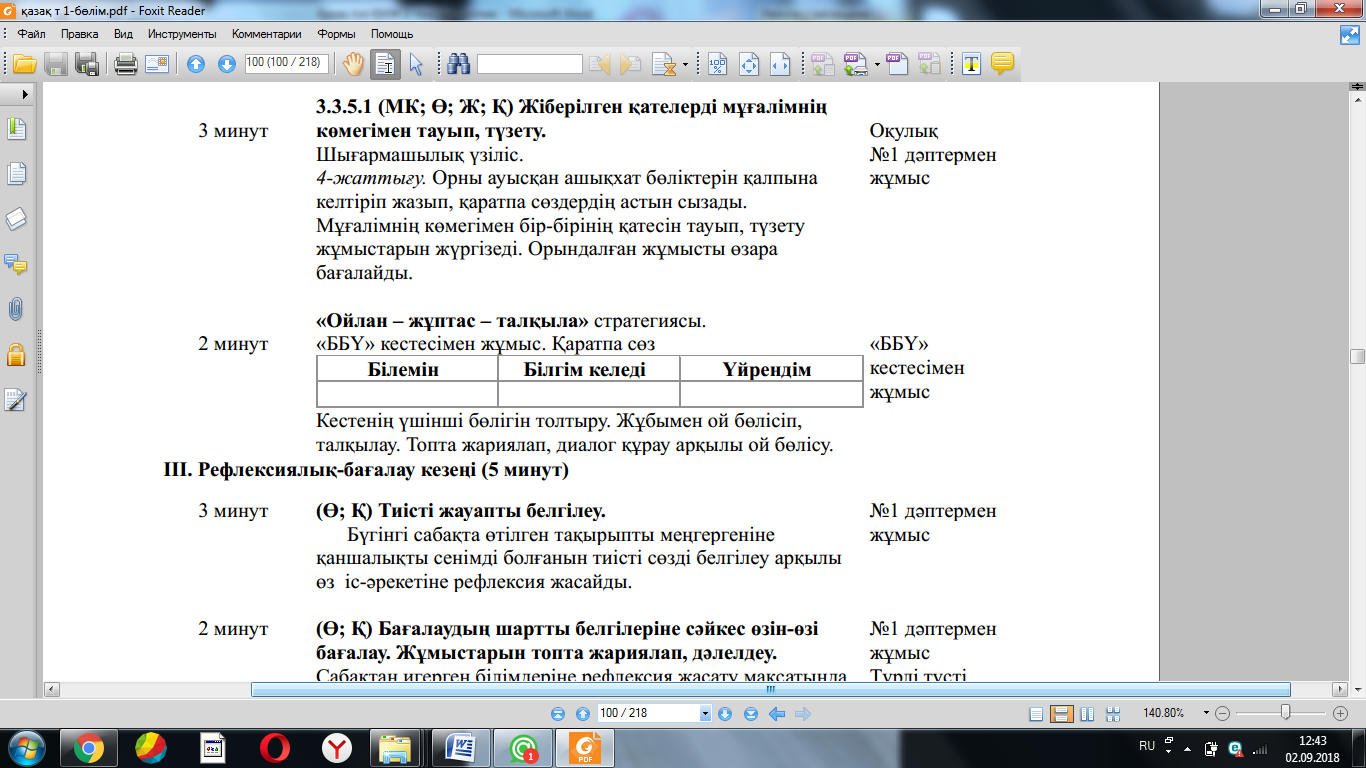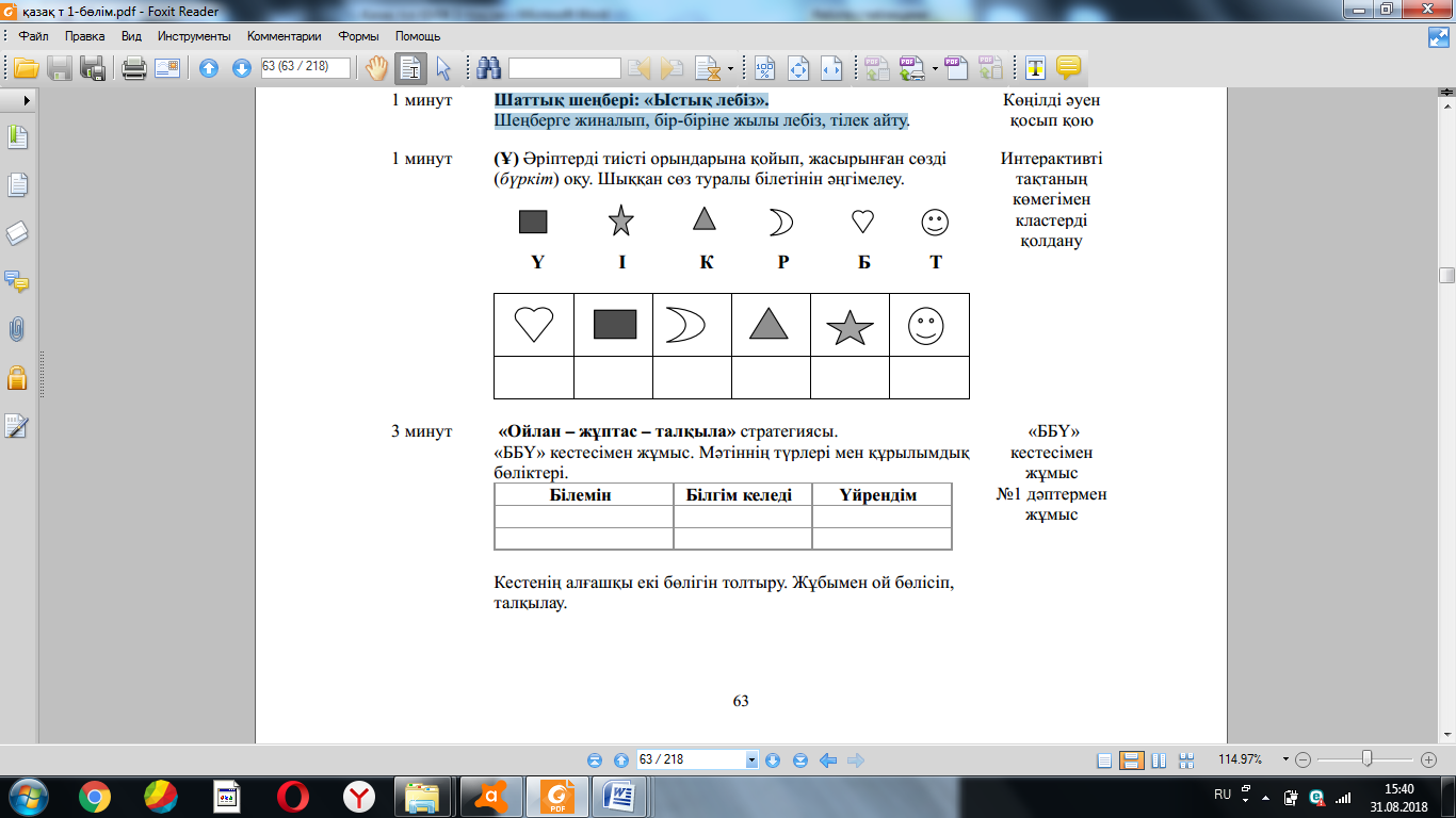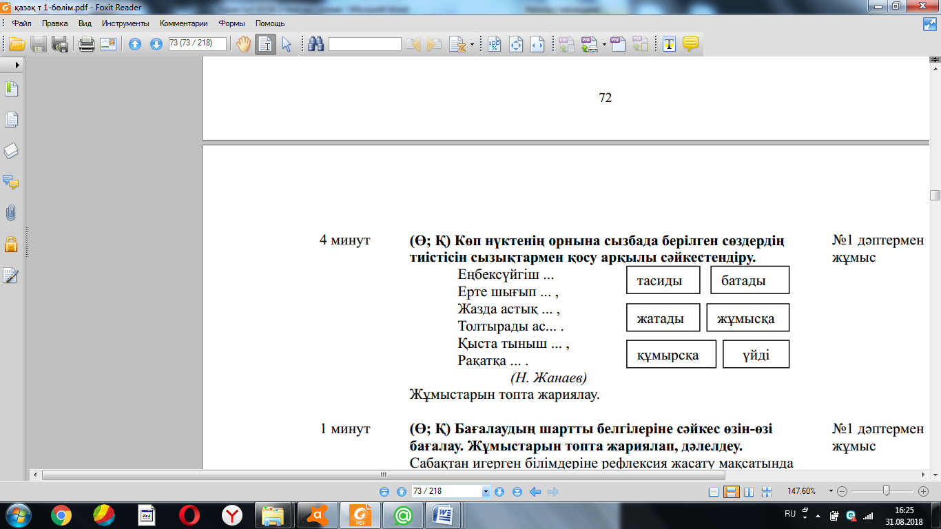 Жаңа білім мен тәжірибені қолдану (МК; Ұ; Қ) Суреттердің көмегімен сұраққа жауап болатын ақпаратты болжай алу білігін бағалау. 4-жаттығу. Суреттердің көмегімен сұраққа жауап болатын ақпаратты болжайды. Суреттерді сөйлеудің ауызекі жəне жазбаша сөйлеу түрлеріне ажыратады. ҚБ: Бағдаршам көздері арқылы бір-бірін бағалау. «Ойлан, Жұптас, Пікірлес» 3.3.5.1 (МК; Ө; Қ) Жіберілген қателерді мұғалімнің көмегімен тауып, түзету. 5-жаттығу. Өлеңді жатқа жазады. Оқушылардың бас əріп пен кіші əріптің биіктігі мен мөлшерін сақтап, оларды байланыстырып көлбеу жəне таза жазуы қадағаланып, бағыт беріледі. Оқулықта берілген сұрақтардың дұрыс жауабын тауып, дəлелдейді. «Өз үйіне кіргіз» ойыны ойнатылады. Берілген сөздерді тиісті үйшіктермен сəйкестендіріп, ой қорыту жасайды. (ҚБ) “Екі жұлдыз, бір тілек” әдісі. Рефлексия (жеке,жұпта,топта, ұжымда) «Білім сандығы» кері байланыс.