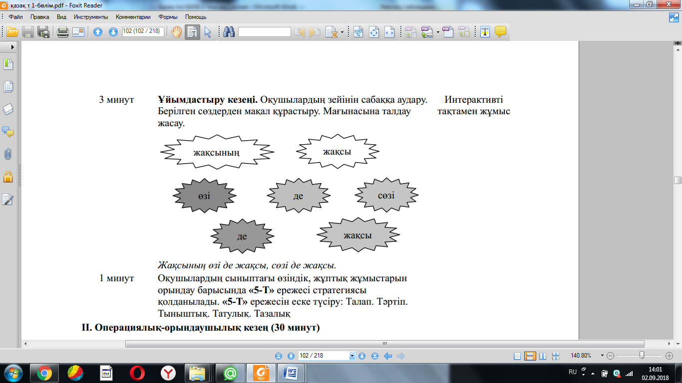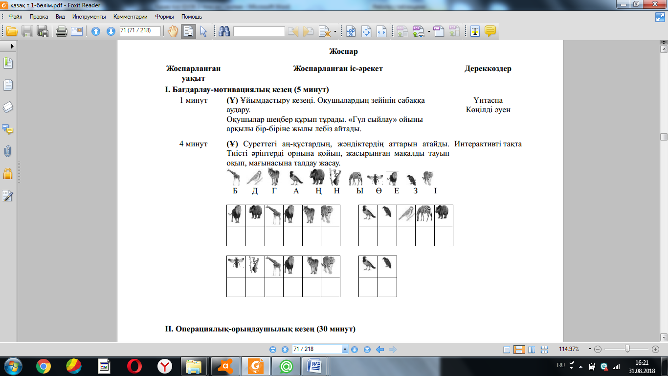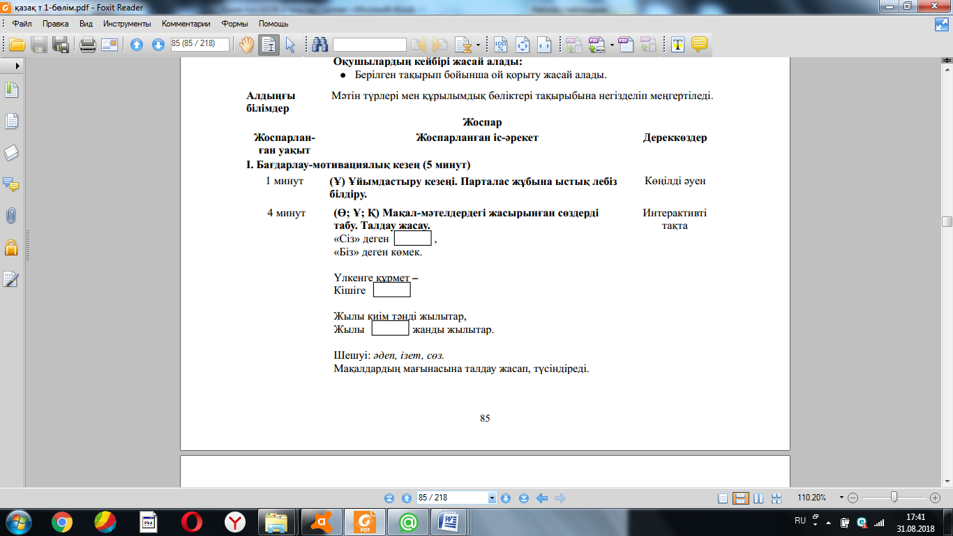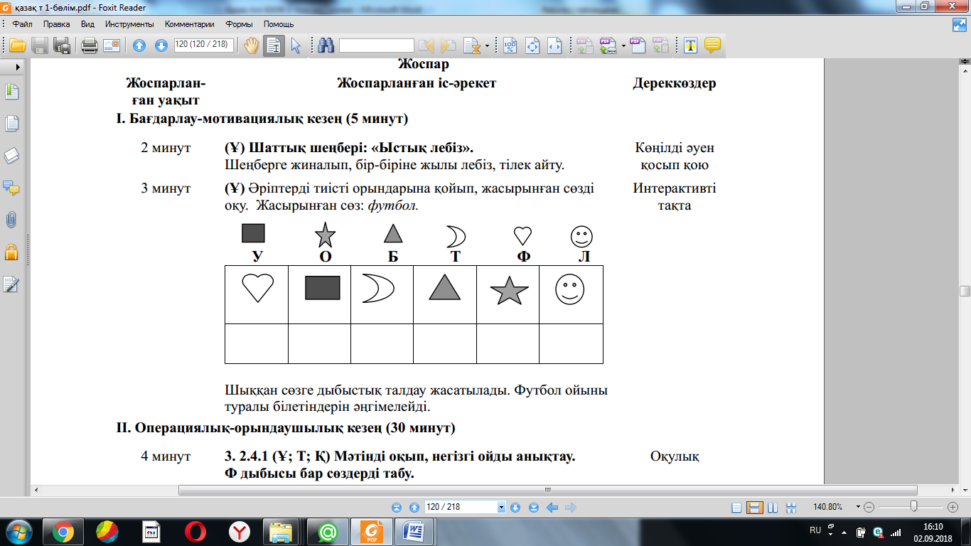 Жаңа білім мен тәжірибені қолдану (МК; Ұ; Қ) Суреттердің көмегімен сұраққа жауап болатын ақпаратты болжай алу білігін бағалау. 4-жаттығу. Суреттердің көмегімен сұраққа жауап болатын ақпаратты болжайды. Суреттерді сөйлеудің ауызекі жəне жазбаша сөйлеу түрлеріне ажыратады. ҚБ: Бағдаршам көздері арқылы бір-бірін бағалау. «Ойлан, Жұптас, Пікірлес» 3.3.5.1 (МК; Ө; Қ) Жіберілген қателерді мұғалімнің көмегімен тауып, түзету. 5-жаттығу. Өлеңді жатқа жазады. Оқушылардың бас əріп пен кіші əріптің биіктігі мен мөлшерін сақтап, оларды байланыстырып көлбеу жəне таза жазуы қадағаланып, бағыт беріледі. Оқулықта берілген сұрақтардың дұрыс жауабын тауып, дəлелдейді. «Өз үйіне кіргіз» ойыны ойнатылады. Берілген сөздерді тиісті үйшіктермен сəйкестендіріп, ой қорыту жасайды. (ҚБ) “Екі жұлдыз, бір тілек” әдісі. Рефлексия (жеке,жұпта,топта, ұжымда) «Білім сандығы» кері байланыс.
