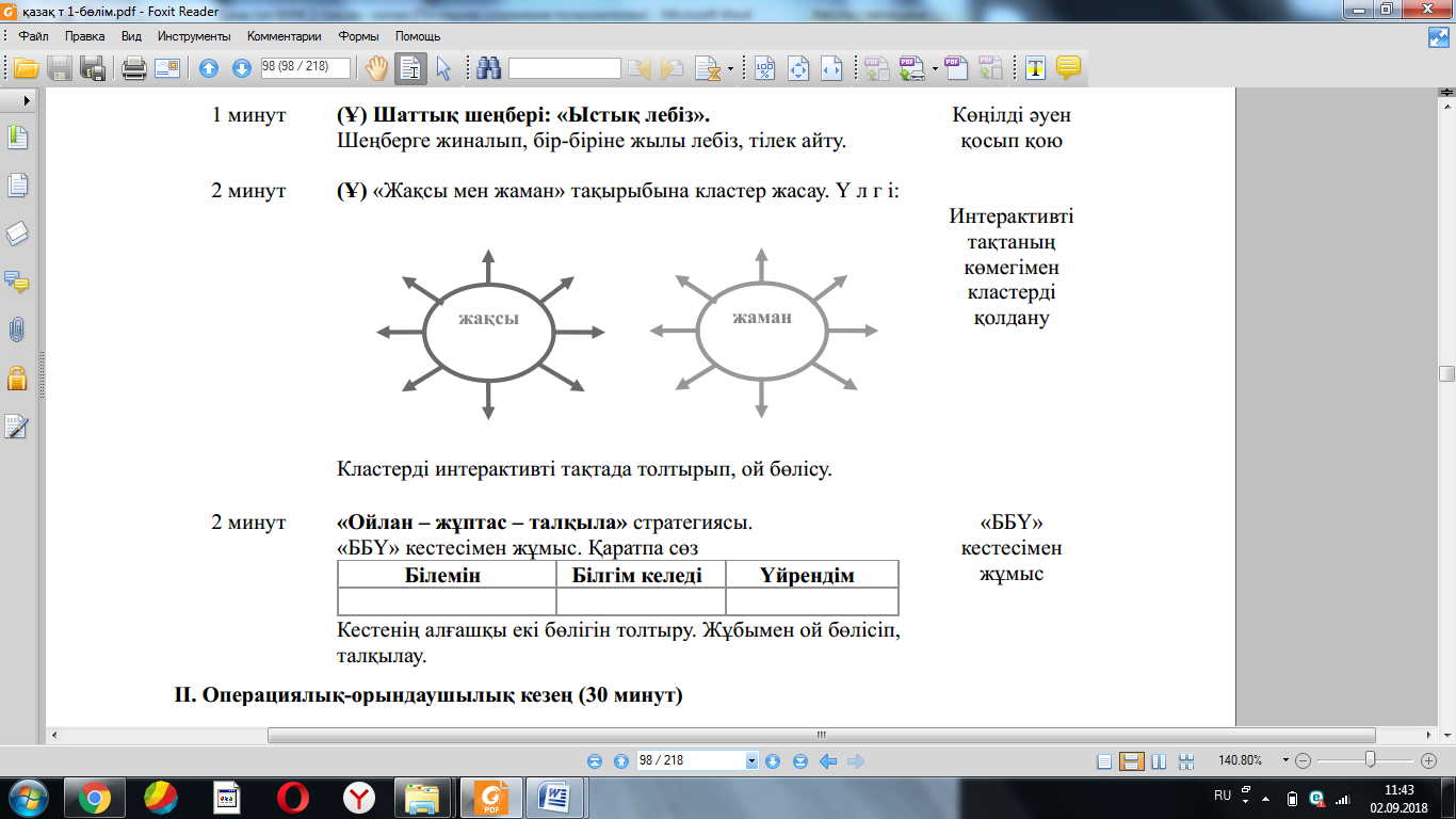 • Жаңа білімді меңгереді. • Диалогке қатысады; мұғалімнің көмегімен негізгі ойды анықтай алады. • Өз ой қорытындысын оқулықтағы жаңа ақпаратпен салыстыра алады. Кез келген жағдайда өз көзқарасын білдіріп, ой қорыту жасай алады. |
