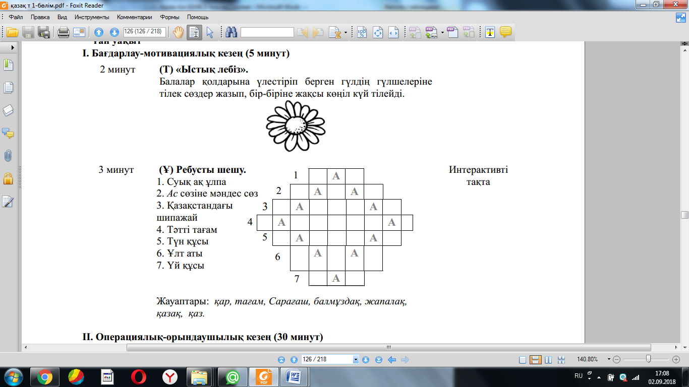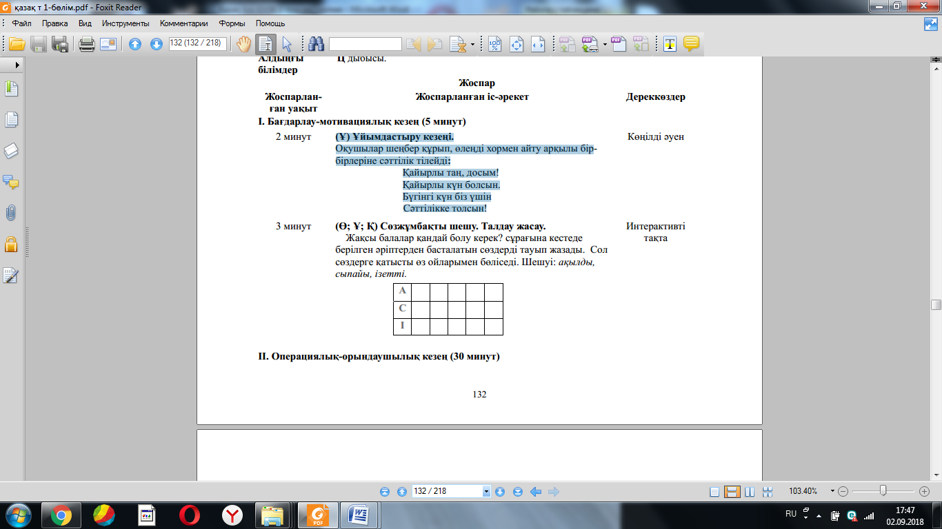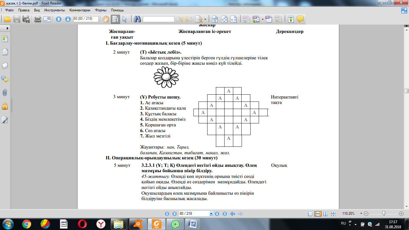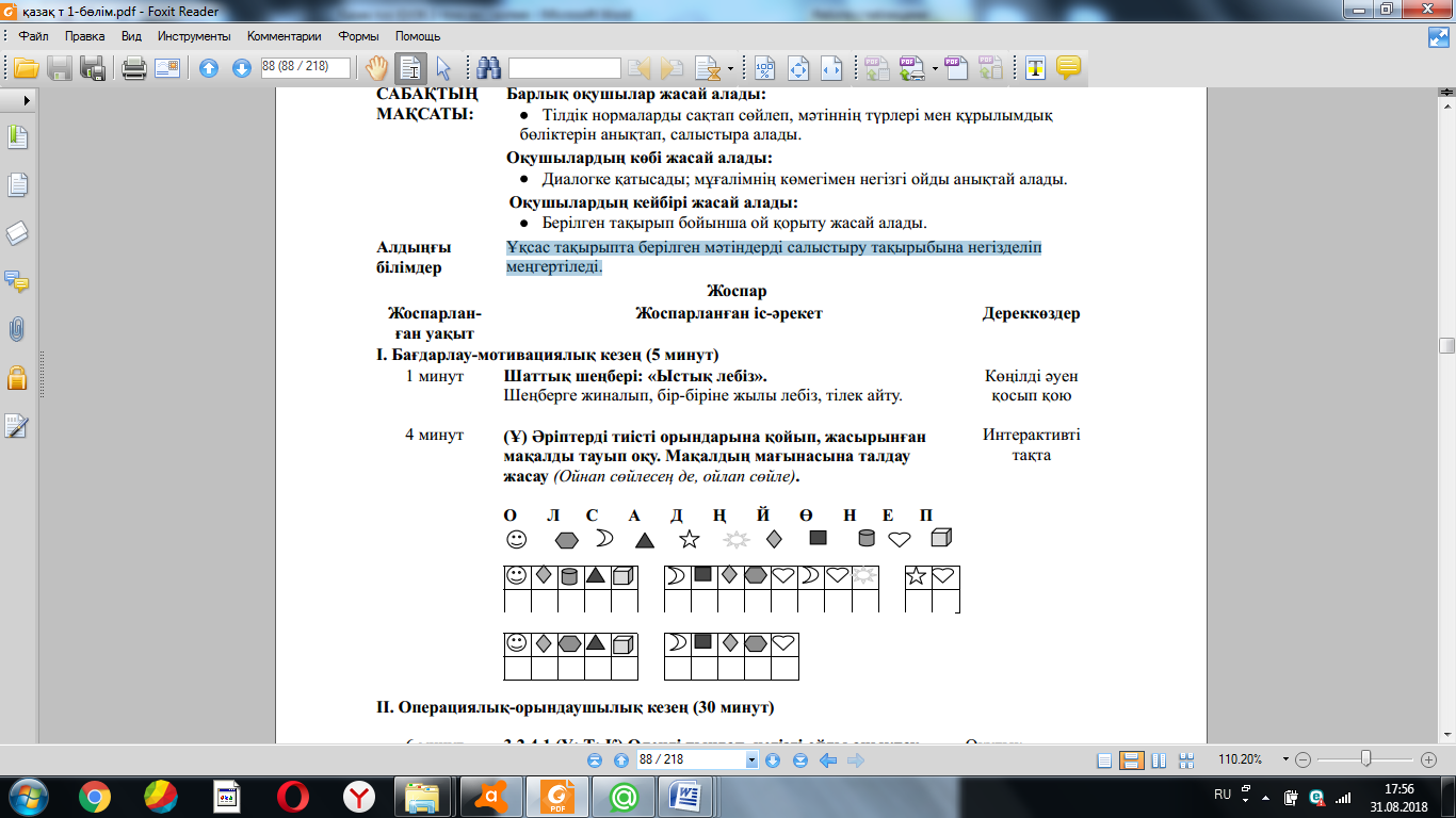 3.1.1.1 тыңдаған материал бойынша тірек сөздерді белгілеу, ашық жəне жабық сұрақтарға жауап беру; 3.2.1.1 тірек сөздер/көмекші сөздер арқылы мəтін түрлерін (əңгімелеу, сипаттау, пайымдау) жəне оның құрылымдық бөліктерін анықтау; 3.2.5.1 берілген тақырып/сұрақ бойынша түрлі дереккөздерден (мəтін/сөздік/сызба/кесте/карта) алынған ақпараттарда кездесетін жаңа сөздердің мағынасын сөздіктер арқылы ашу, жүйелеу, мағлұматтардың маңызды тұстарын анықтау; 3.3.6.1 бас əріп пен кіші əріптің биіктігі мен мөлшерін сақтап көлбеу, үзбей жəне біркелкі жазу, жазу қарқынын жеделдету. |