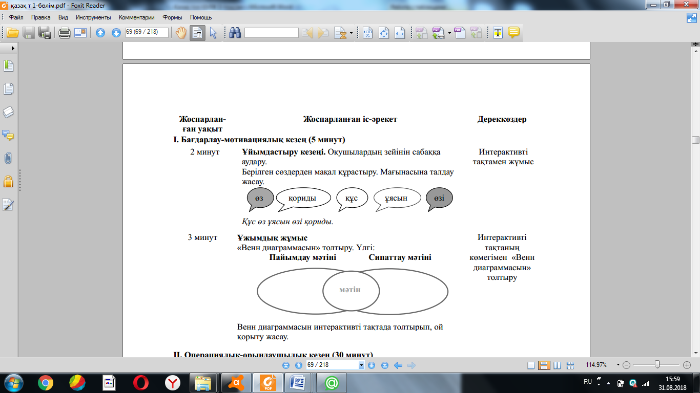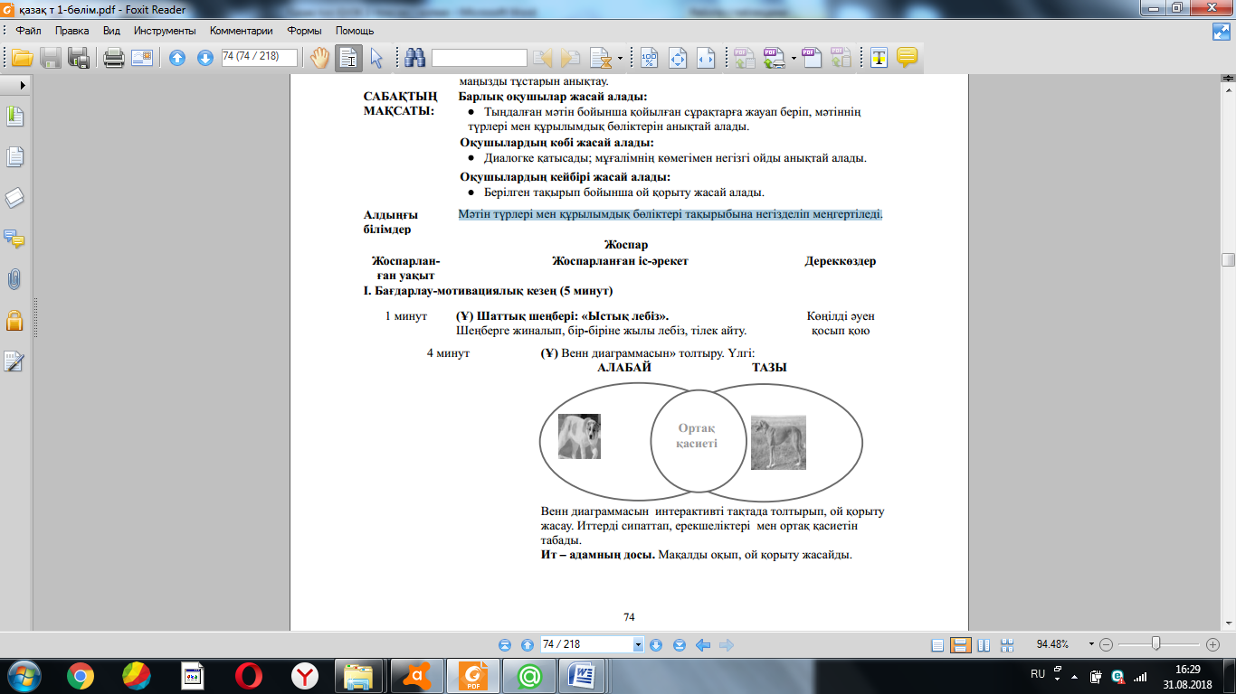 Алдыңғы білімді еске түсіру (ұжымда) Венн диаграммасын интерактивті тақтада толтырып, ой қорыту жасау. ҚБ: Отшашу арқылы бір-бірін бағалау. Оқу мақсатын таныстыру Күтілетін нәтижені анықтау |