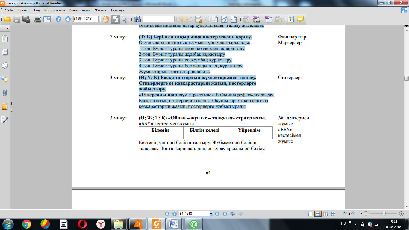жазу. ҚБ: Бағдаршам көздері арқылы бір-бірін бағалау. «Ойлан, Жұптас, Пікірлес» (Ө; Қ) Суретке қарап, тірек сөздерді табу. Оқушылар дəптерде берілген тапсырманы оқиды. Суретке мұқият назар аударып, тірек сөздерді тауып жазады. Жазған жұмысын топта жариялап оқиды. (ҚБ) “Екі жұлдыз, бір тілек” әдісі.