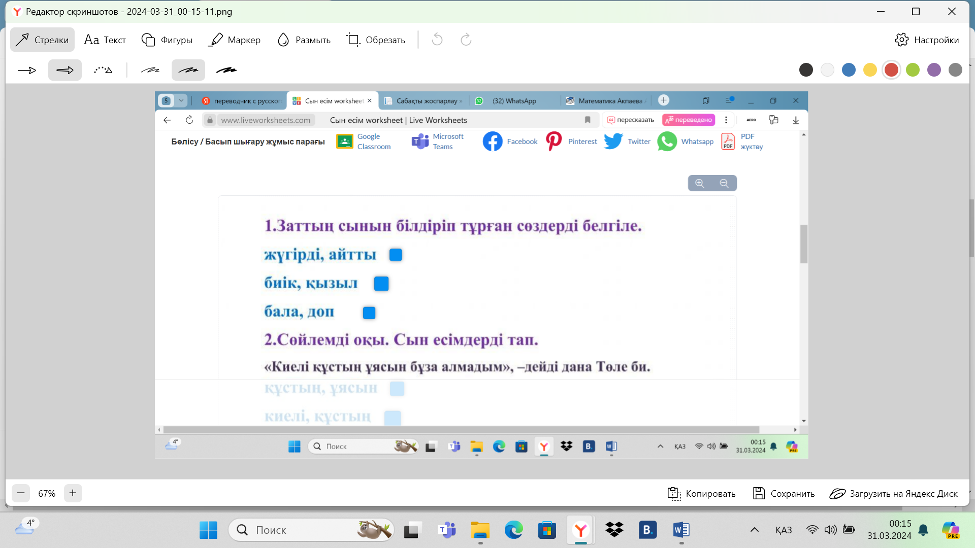 1-тапсырма. Берілген сөздерден дұрыс сөйлем құрастырып жаз.