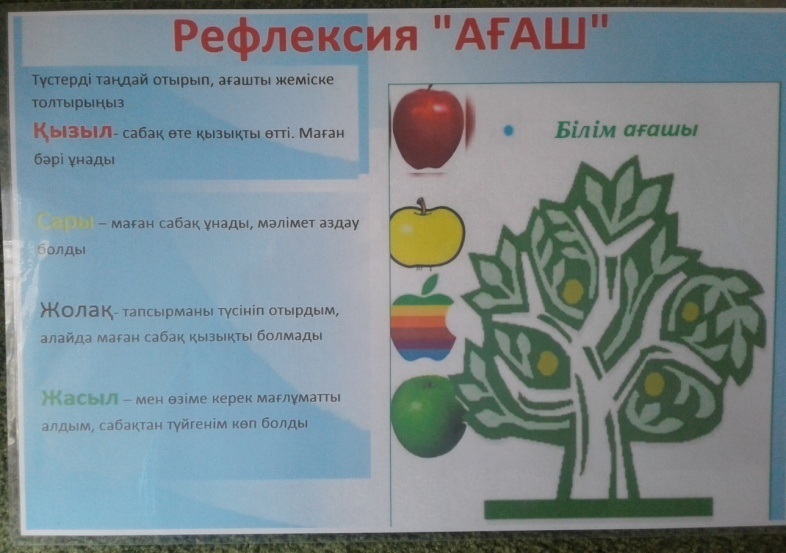 Оқушылар сабақ барысында нені білгені, қалай жұмыс істегенін, қызық әрі жеңіл болғанын және қиындық туғызғандығын ағаш арқылы білдіреді. |