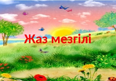 Жаз мезгілі басталды. Жазғы демалыста әртүрлі ойындар ойнаймыз. Достармен саяхатқа шықтық. Жазда мен досымды туған күнімен құттықтадым. Мен табиғатты жақсы көремін. Жазғы даладан әртүрлі құстарды, көбелектерді, құрттар мен инеліктерді көруге болады. Шөптерді, гүлдерді және биік ағаштарды да көрдік.
