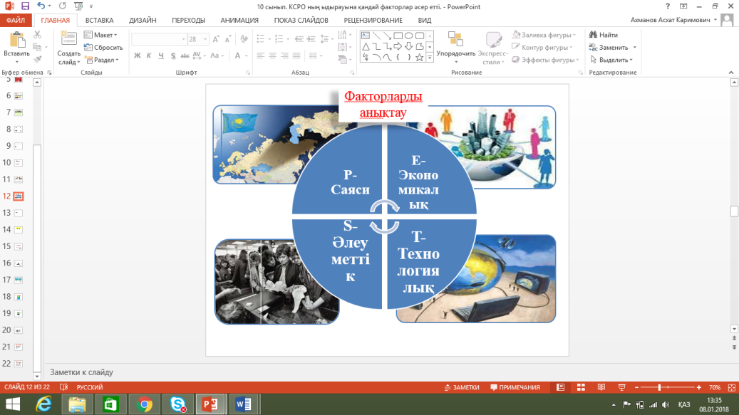 КСРО ыдырауының басқа да себептерін түсіндіру КСРО –ның ыдырау себептері Кеңес қоғамының авторитарлық жүйесі. Бір идеологияның үстемдігі. Кеңестік жүйені өзгертудегі сәтсіз реформалар. Жаппай тауар тапшылығы Экстенсивті экономика Экономикалық дағдарыс Мемлекет қаржысын талан-таражға салу Әлемде мұнай бағасының түсіуі Ұлтаралық қақтығыстардың жиілеуі. Бір орталыққа бағынудан бастарту ЕБҚ оқушы (көру және есту қабілеті төмен) сұрақтарға жауапты жазбаша ұсынады. Мәтінмен жұмыс. Оқушылар мәтінді, тапсырмаларды орындайды. КСРО-ның ыдырауына әсер еткен факторларды PESTанализ арқылы анықтау.