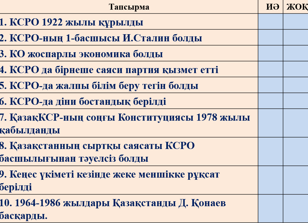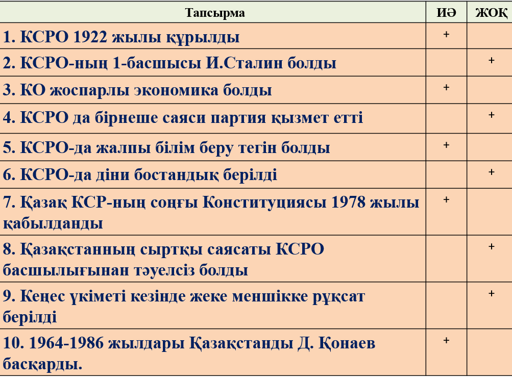 Оқушылардың тапсырмалар арқылы алған білімдерін қорытындылап, сабақтың негізгі ұғымдарын еске түсіреді. Бағалау критерийлері: -Кеңес үкіметі кезіндегі орын алған әлеуметтік-экономикалық проблемаларды талдайды |