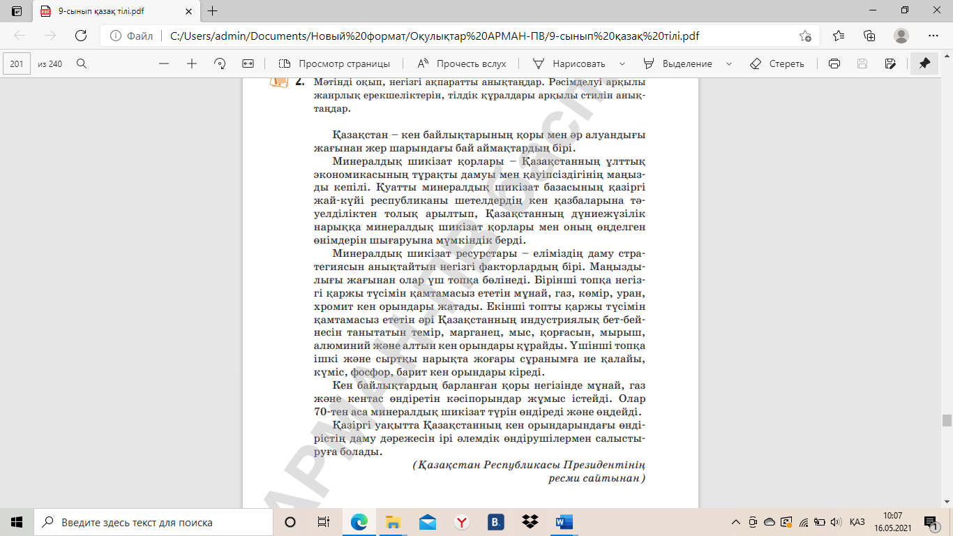 Барлық 400 000 материалдарды шексіз жүктеу мүмкіндігіне ие боласыз 1 990 ₸ 49 000₸ 1 айға қосылу Материалға шағымдану Бұл материал сайт қолданушысы жариялаған. Материалдың ішінде жазылған барлық ақпаратқа жауапкершілікті жариялаған қолданушы жауап береді. Ұстаз тілегі тек ақпаратты таратуға қолдау көрсетеді. Егер материал сіздің авторлық құқығыңызды бұзған болса немесе басқа да себептермен сайттан өшіру керек деп ойласаңыз осында жазыңыз Жариялаған: Рамазанова Сырга КаирбековнаШағым жылдам қаралу үшін барынша толық ақпарат жіберіңіз Қазақстан Республикасының минералдық ресурстары