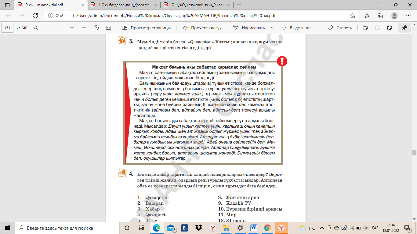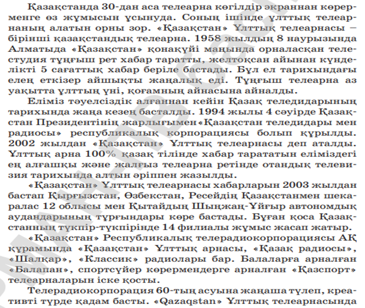 7-тапсырма. Сыныптастарыңмен топтаса отырып, шағын телебағдарлама сценарийін құрыңдар. Бір-біріңнің жұмыстарыңа түзетулер енгізіп, редакциялаңдар. Дескриптор: