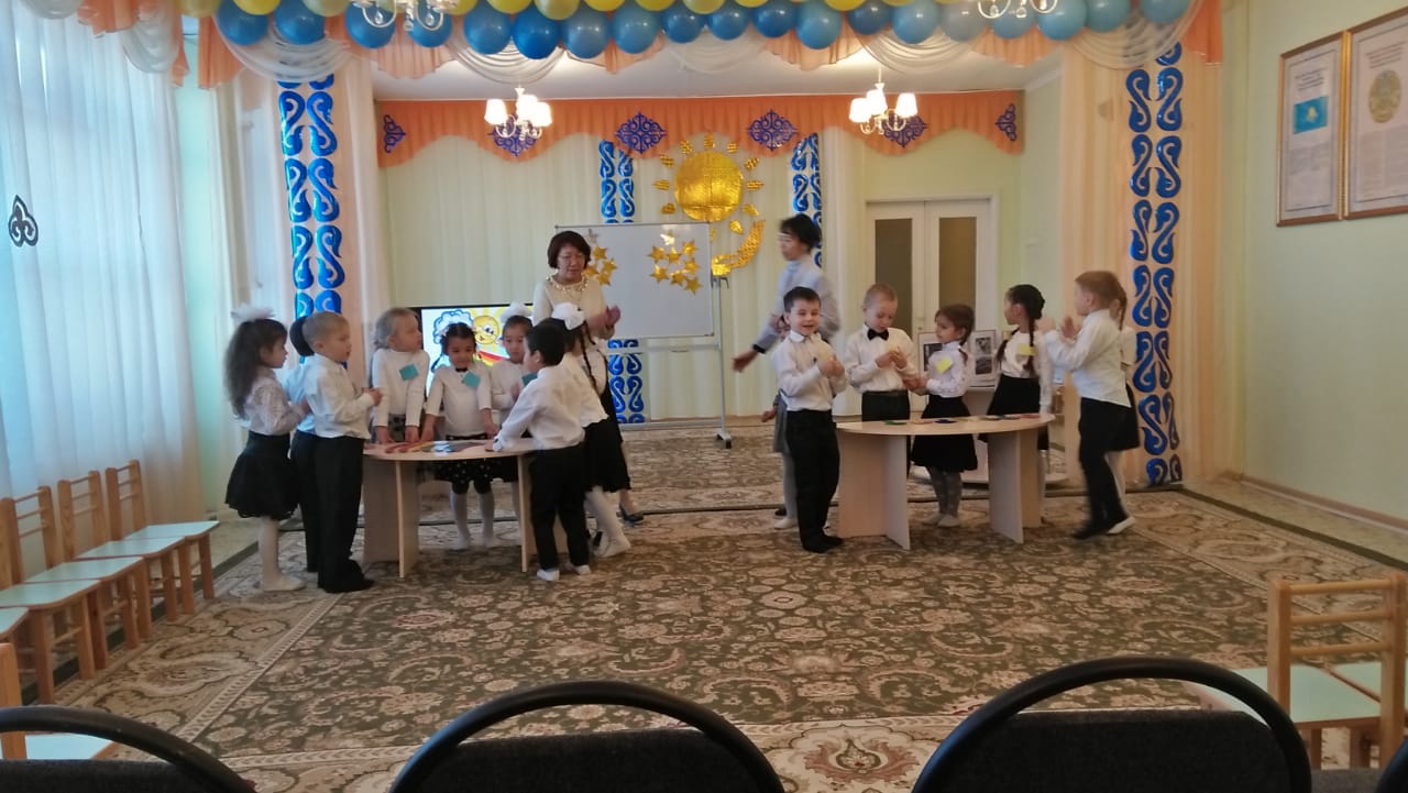 Балалар залға кіріп, жарты шеңберге тұрады.