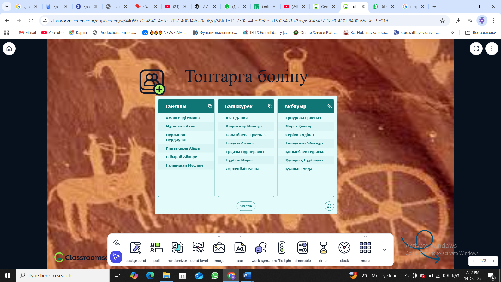 Мұғалім оқушылармен амандасып, түгендеп оқушылардың назарын сабаққа аударып, сабаққа сәттілік тілеп, тілек айту. Оқушылар жаңа сабаққа қатысты суреттер арқылы үш топқа бөлінеді. (петроглиф, пиктография, Тамғалы тас) Видео қарап, сұрақтарға жауап беру: 1. Суретте не көріп тұрсыңдар? 2. Суретке ат қойындар? 3. Бұл суреттің біздің сабағымызға қатысы қандай? Жаңа терминдермен жұмыс