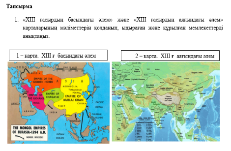 Бағалау критерийі: Карталарды қолданып XIII–XV ғасырлардағы мемлекеттердегі саяси үдерістерге түсіндірме жасайды Бағалау балы: -карта мәліметтерін қолданып, ХІІІ ғасырдың басында Орталық Азияда өмір сүрген мемлекеттерді сипаттайды-1б -картаның мәліметтерін қолданып, ХІІІ ғ аяғында Монғолияда өмір сүрген мемлекеттерді анықтайды-1б -Монғол мемлекетінің құрылғанын анықтайды-1б -Қорытынды келтіреді-1б Жалпы-4 балл Бағалау балы: -Отырардың қоршауы болған жылды анықтайды-1б -Сырдария бойындағы қалалардың жаулануы-1б -Жошы ұлысының құрылуы-1б -Шыңғыс ханның Хорезмге жорығы-1б Жалпы-4 балл |