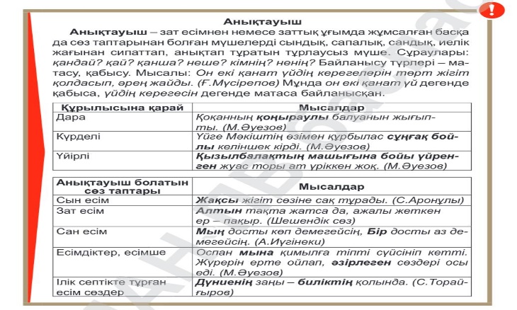 Дескриптор:3ұ -Дара анықтауышқа мысал кетіреді. -Күрделі анықтауышқа мысал жазады. -Үйірлі анықтауышқа мысал табады.